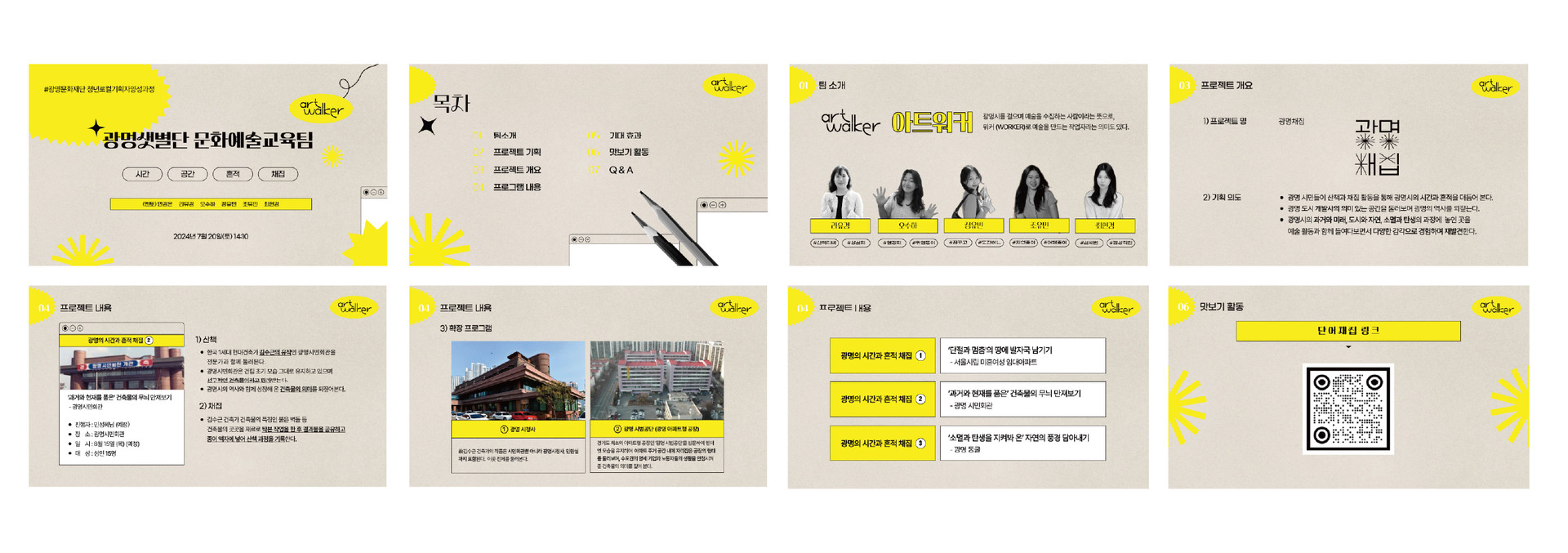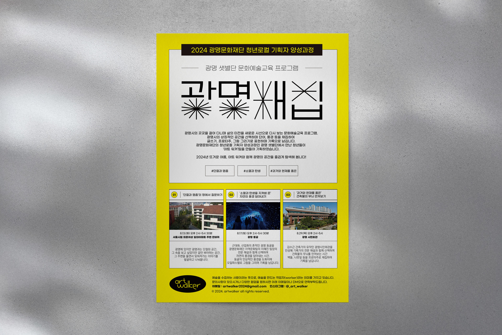 2024년도 광명문화재단의 청년 로컬기획자 양성과정 ‘광명샛별단’의 문화예술교육팀 '아트워커(art walker)의 프로그램 「광명채집」을 소개하는 홍보물입니다.
